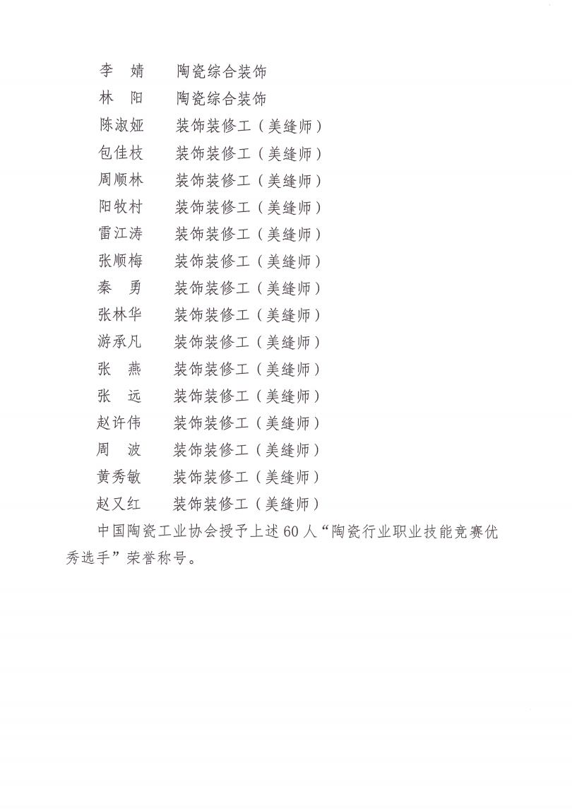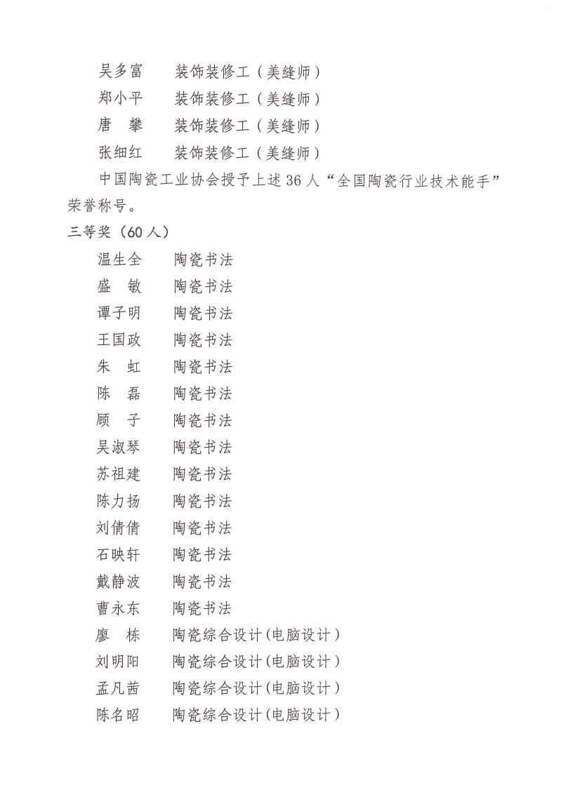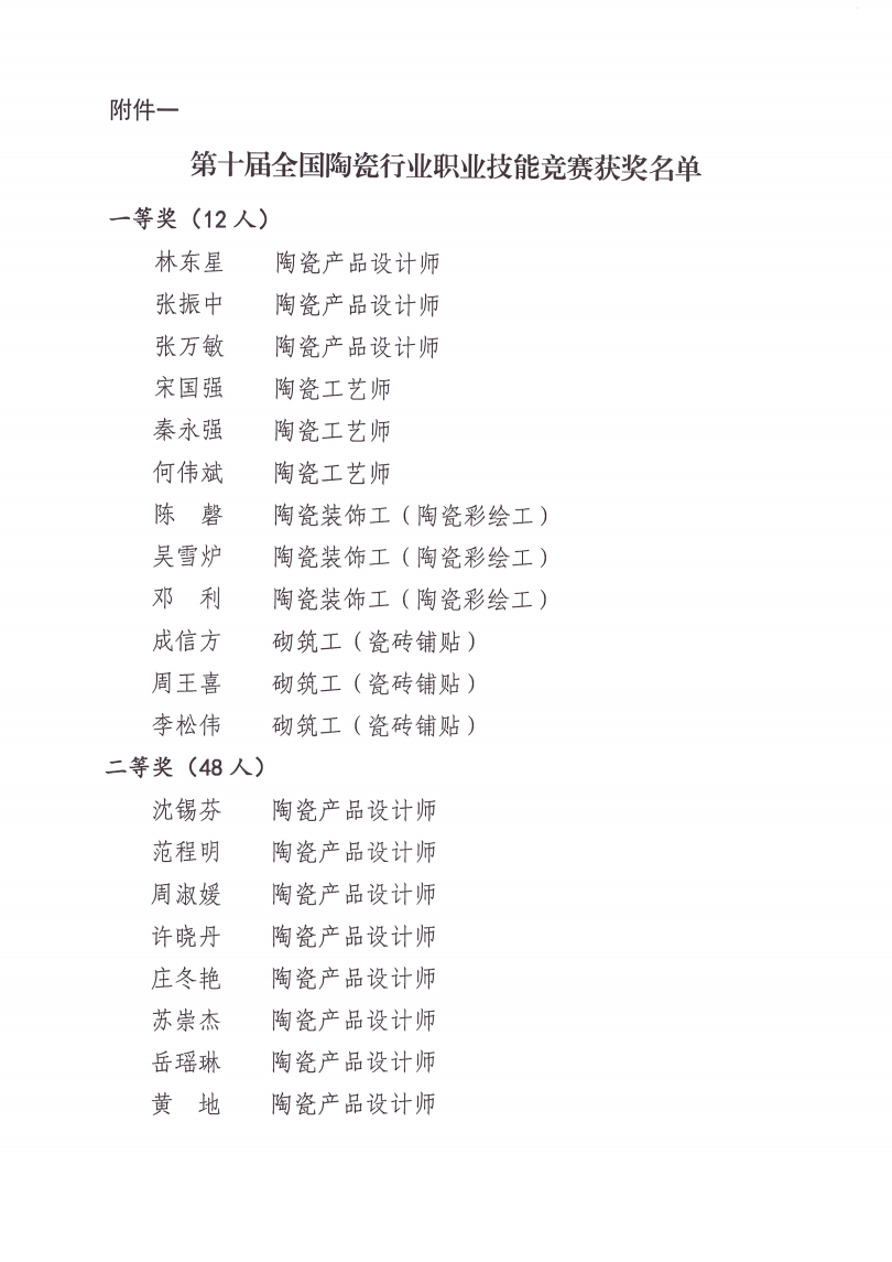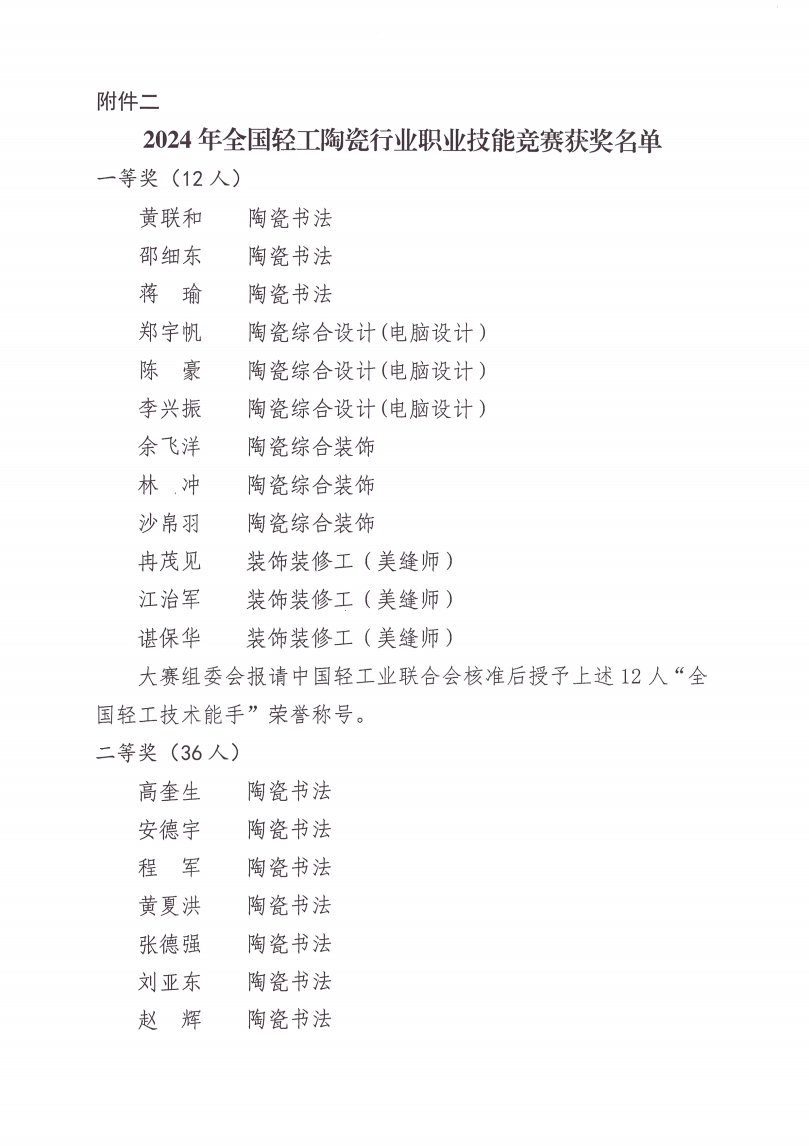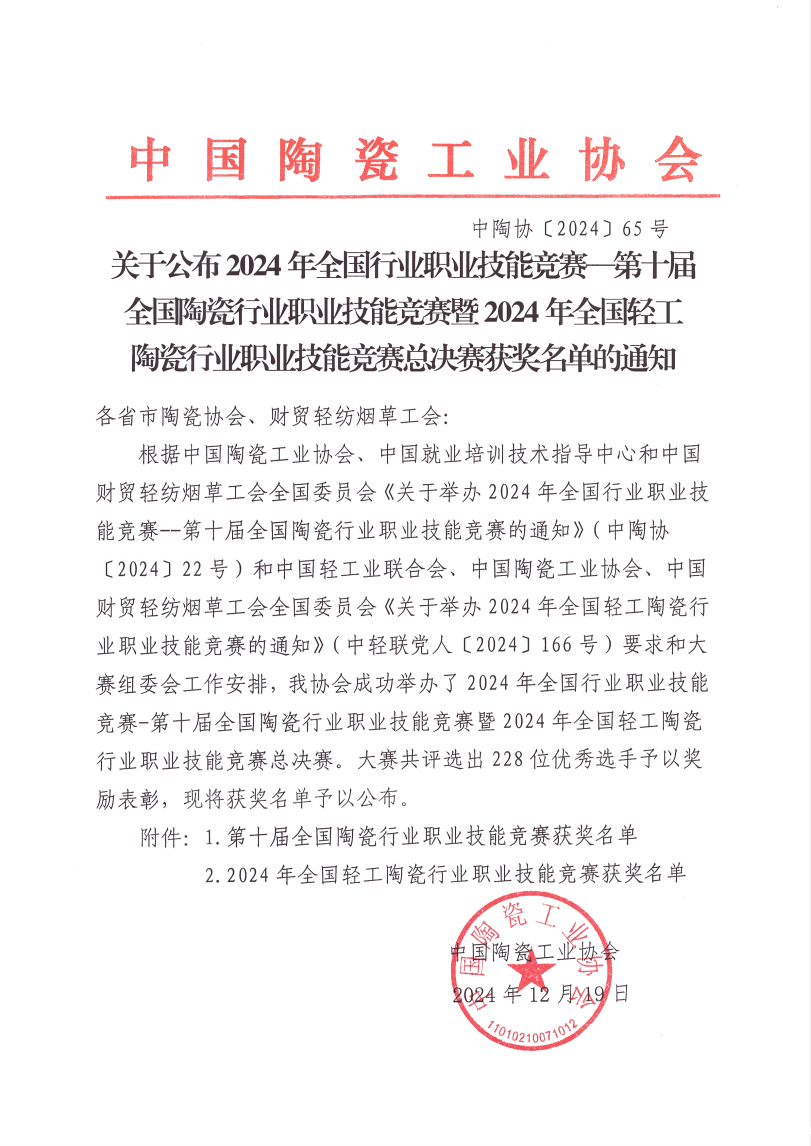 关于公布2024年全国行业职业技能竞赛-第十届全国陶瓷行业职业技能竞赛暨2024年全国轻工陶瓷行业职业技能竞赛总决赛获奖名单的通知