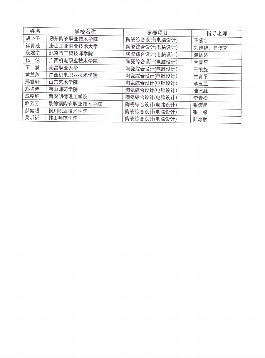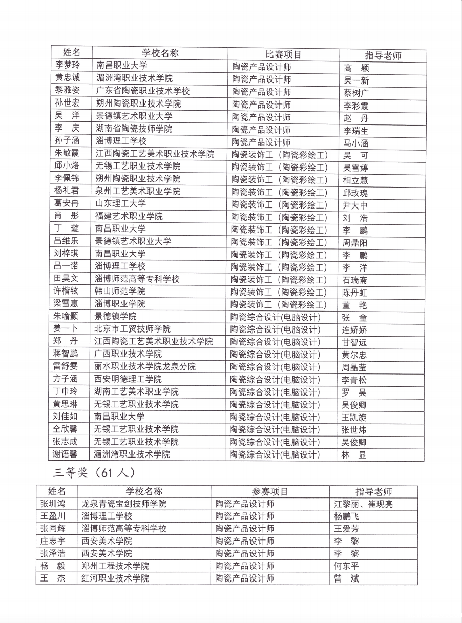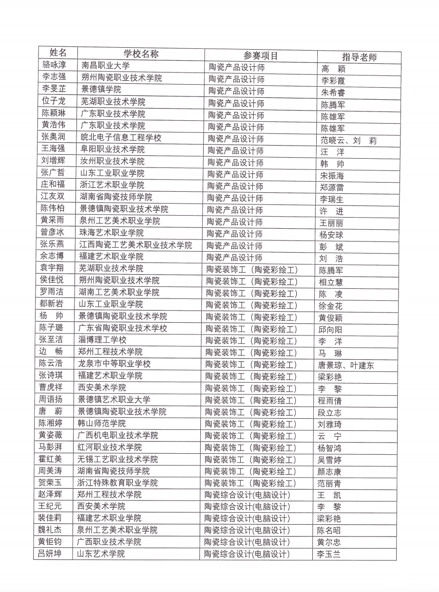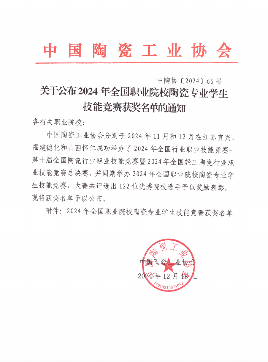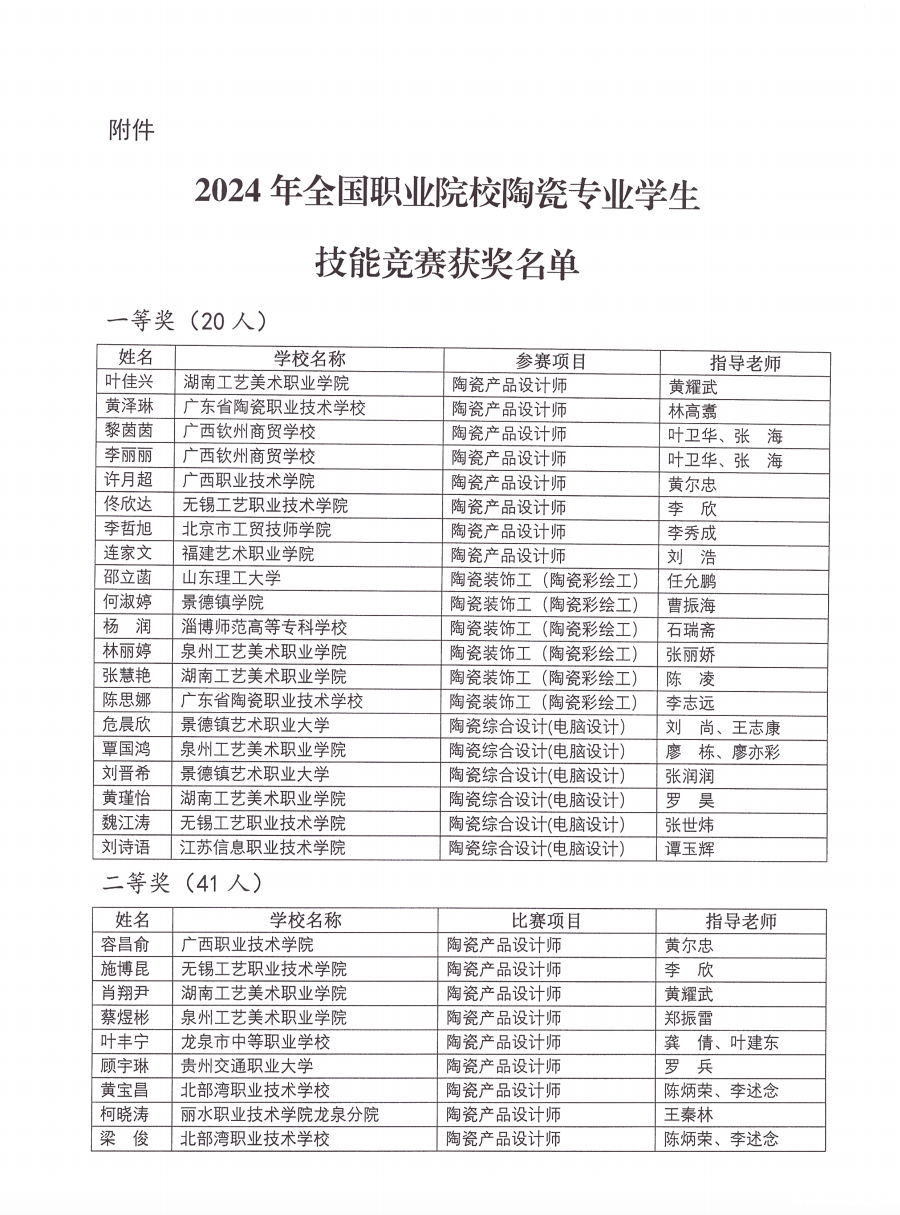 关于公布2024年全国陶瓷职业院校学生技能竞赛获奖名单的通知