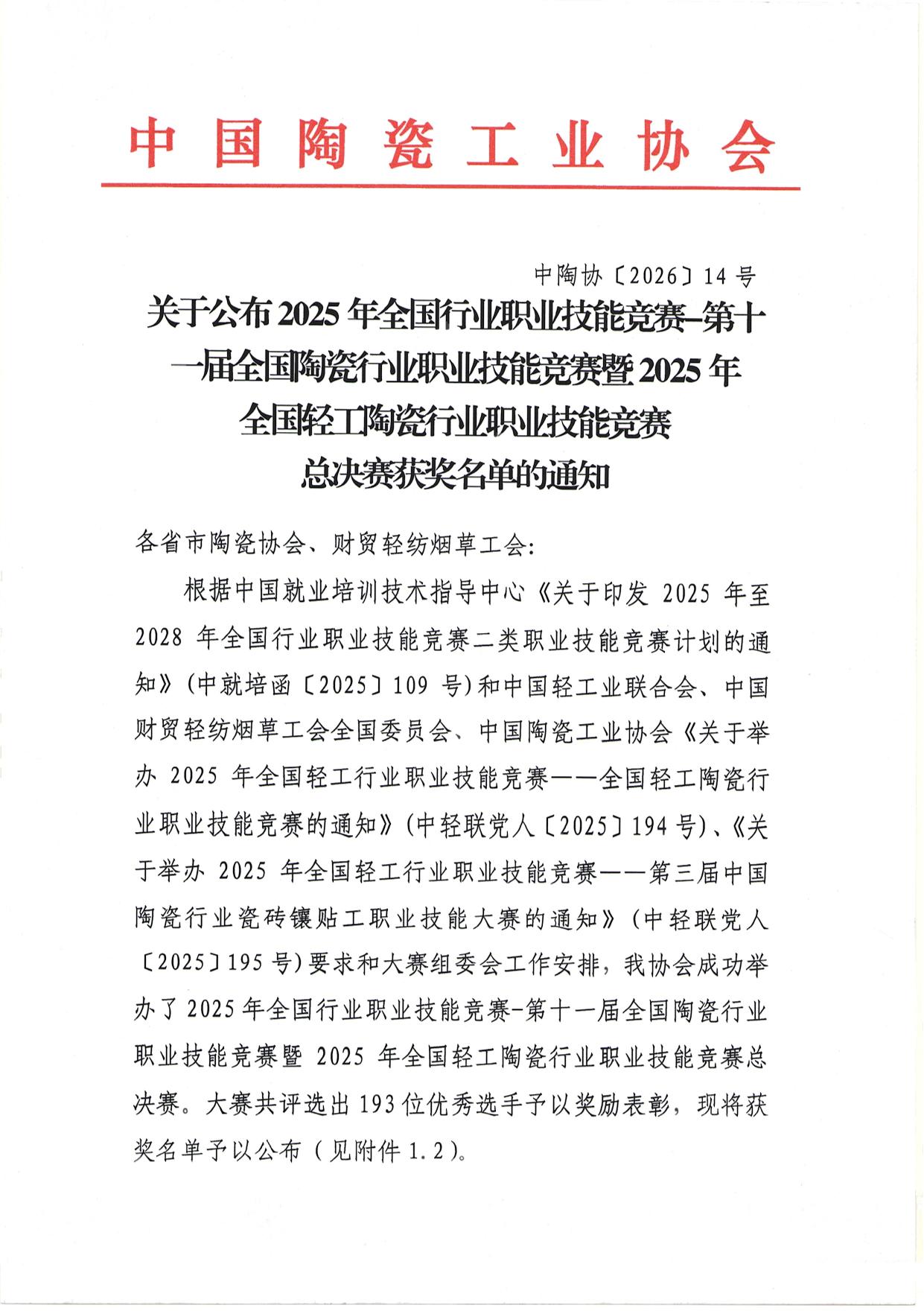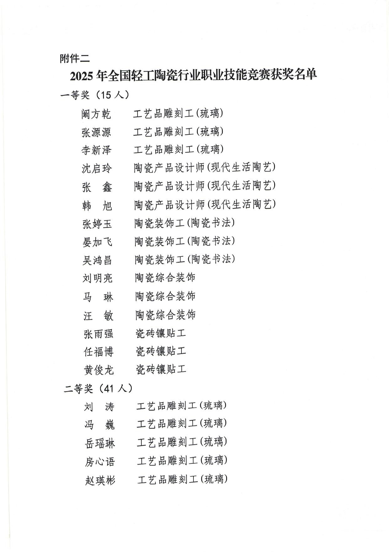 关于公布2025年全国行业职业技能竞赛-第十一届全国陶瓷行业职业技能竞赛暨2025年全国轻工陶瓷行业职业技能竞赛总决赛获奖名单的通知
