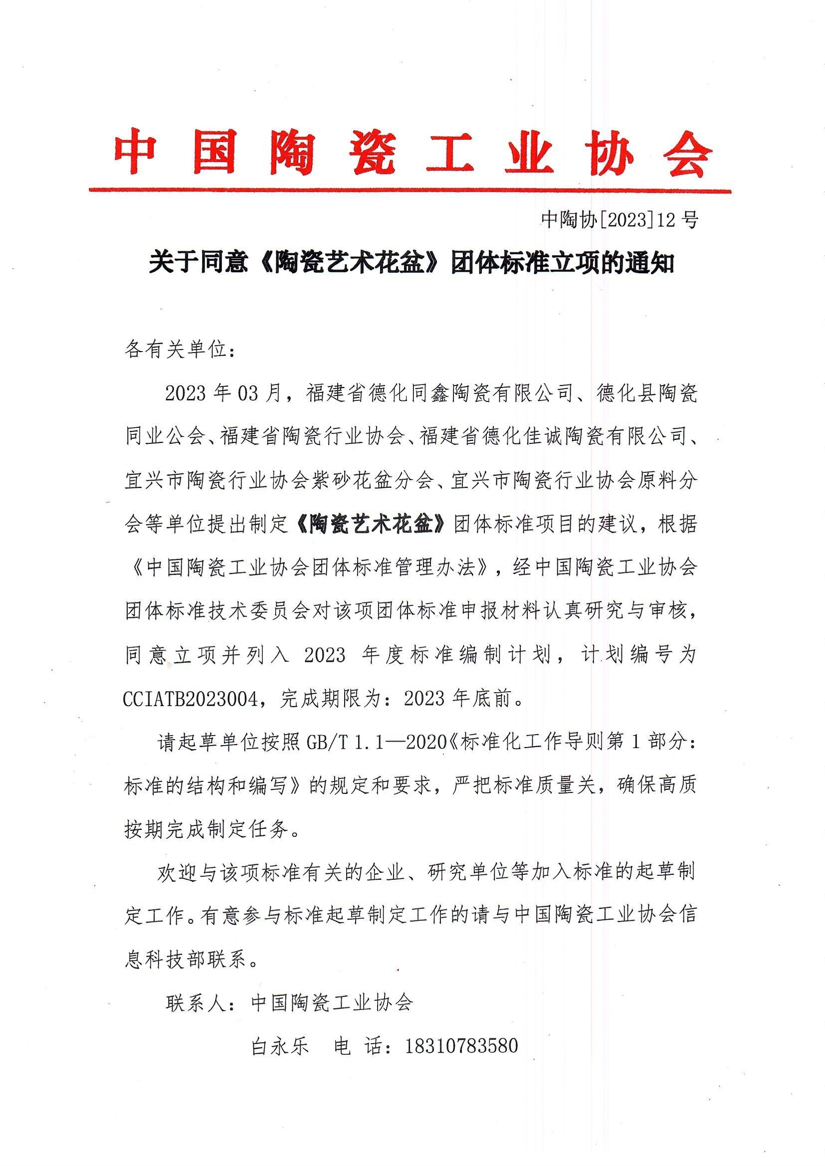 2023年03月,福建省德化同鑫陶瓷有限公司、德化县陶瓷同业公会、福建省陶瓷行业协会、福建省德化佳诚陶瓷有限公司、宜兴市陶瓷行业协会紫砂花盆分会、宜兴市陶瓷行业协会原料分会等单位提出制定《陶瓷艺术花盆》团体标准项目的建议,根据《电脑版taptap官方团体标准管理办法》,经电脑版taptap官方团体标准技术委员会对该项团体标准申报材料认真研究与审核,同意立项并列入2023年度标准编制计划,计划编号为CCIATB2023004,完成期限为:2023年底前。
