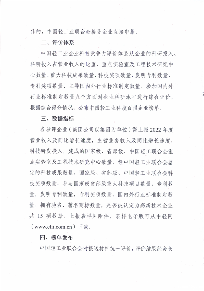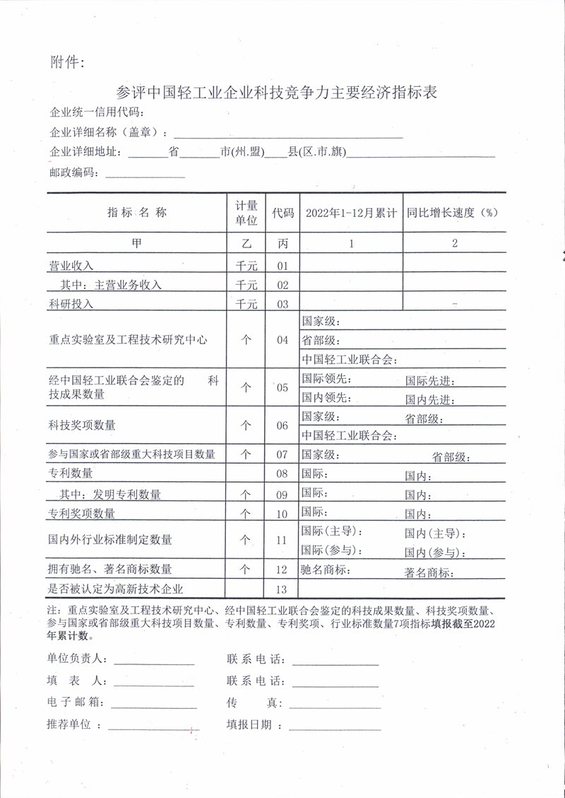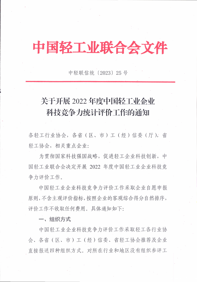 关于开展 2022 年度中国轻工业企业科技竞争力统计评价工作的通知