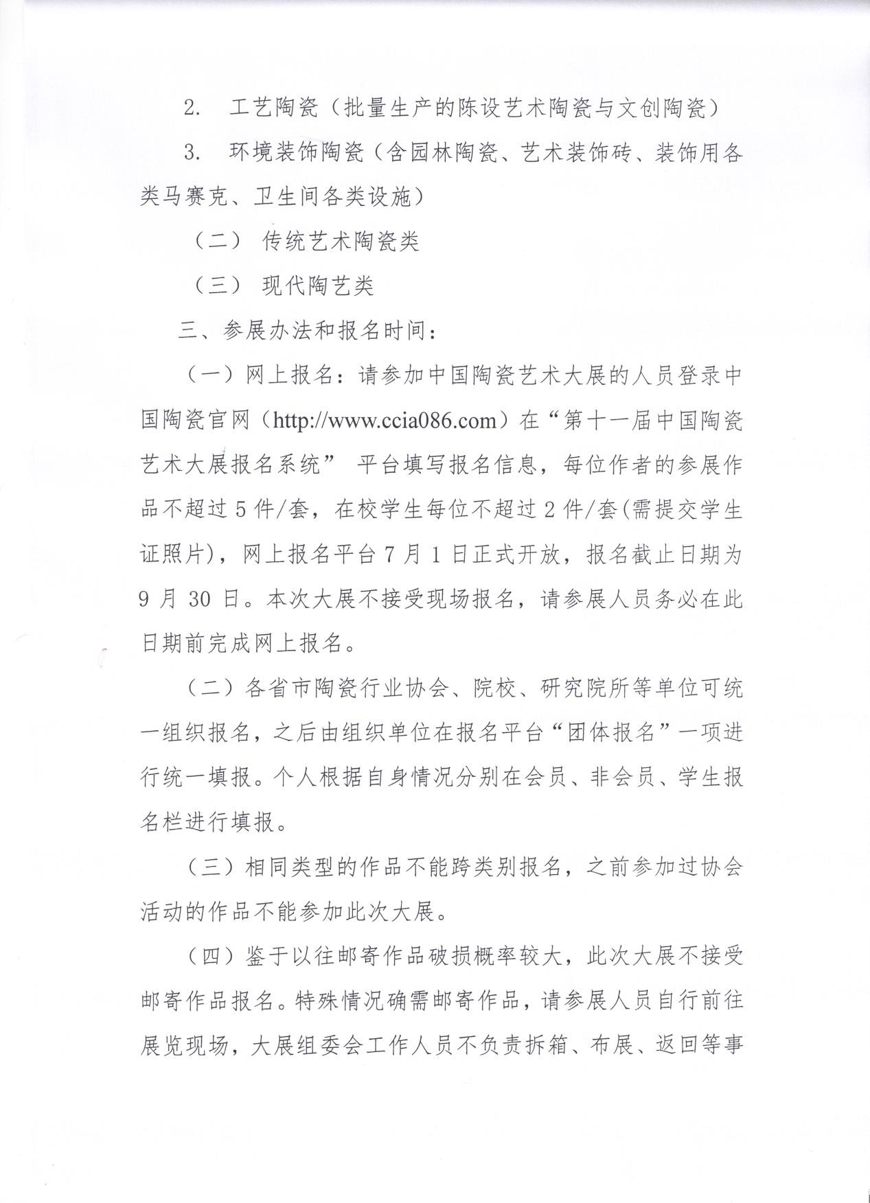 (一)网上报名:请参加中国陶瓷艺术大展的人员登录中国陶瓷官网(http://www.ccia086.com)在“第十一届中国陶瓷艺术大展报名系统” 平台填写报名信息,每位作者的参展作品不超过5件/套,在校学生每位不超过2件/套(需提交学生证照片),网上报名平台7月1日正式开放,报名截止日期为9月30日。本次大展不接受现场报名,请参展人员务必在此日期前完成网上报名。