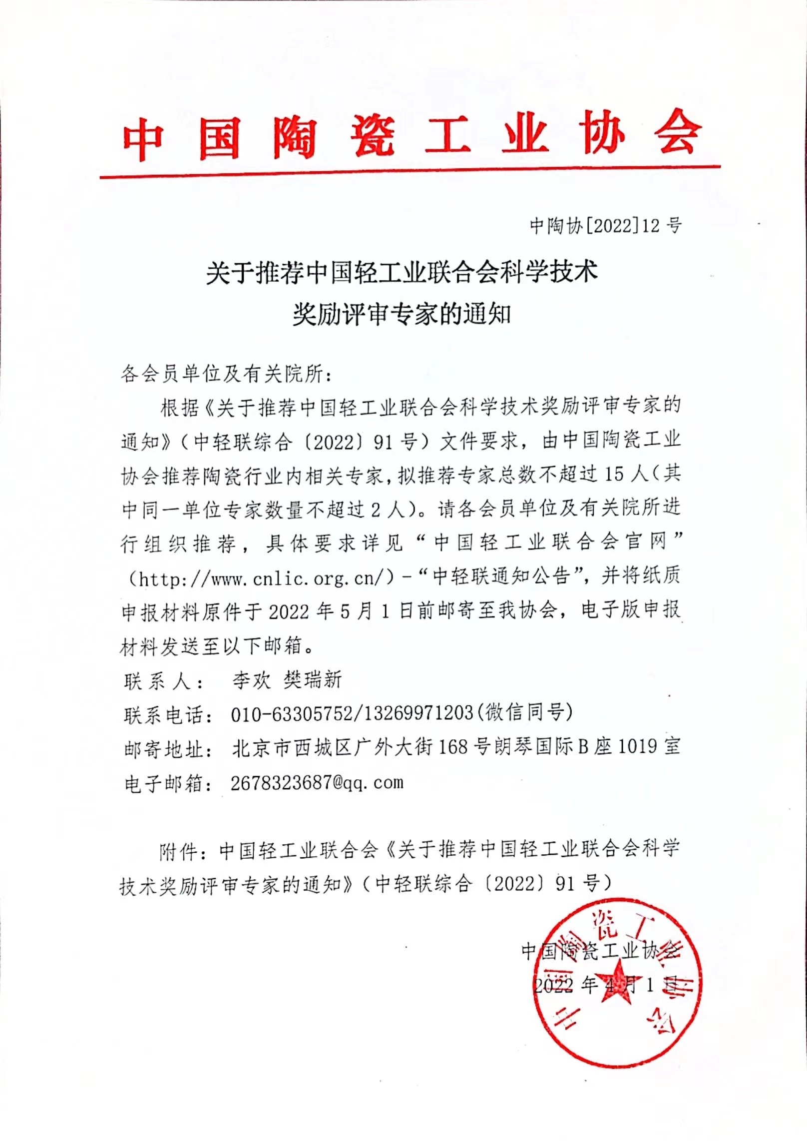 根据《关于推荐中国轻工业联合会科学技术奖励评审专家的通知》(中轻联综合〔2022〕91号)文件要求,由电脑版taptap官方推荐陶瓷行业内相关专家,拟推荐专家总数不超过15人(其中同一单位专家数量不超过2人)。请各会员单位及有关院所进行组织推荐,具体要求详见“中国轻工业联合会官网”(http://www.cnlic.org.cn/)-“中轻联通知公告”,并将纸质申报材料原件于2022年5月1日前邮寄至我协会,电子版申报材料发送至以下邮箱。