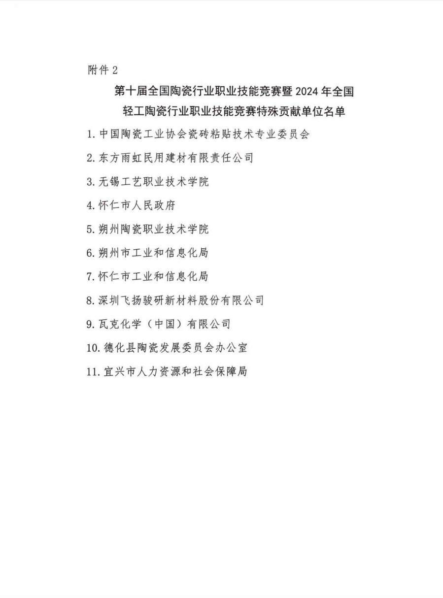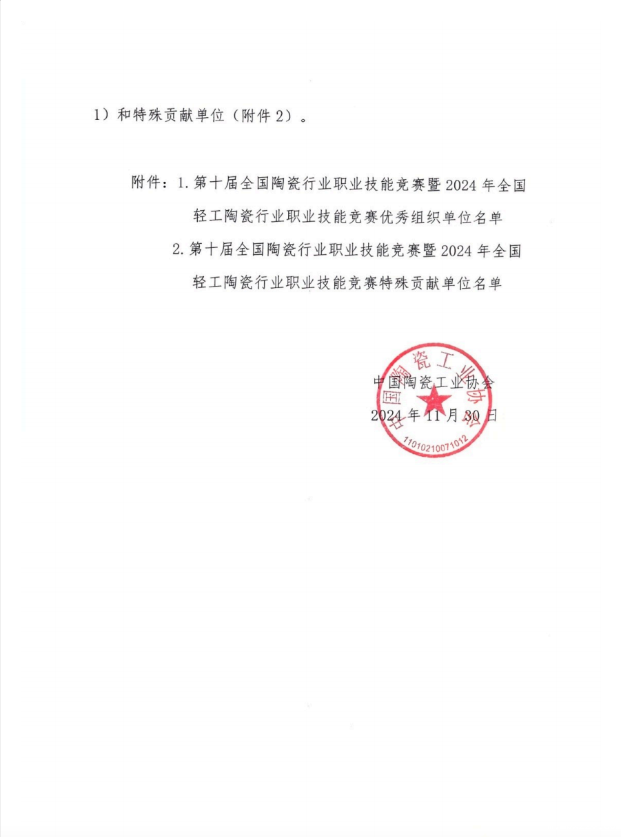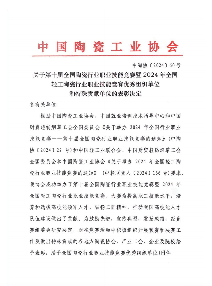 关于第十届全国陶瓷行业职业技能竞赛暨2024年全国轻工陶瓷行业职业技能竞赛优秀组织单位和特殊贡献单位的表彰决定