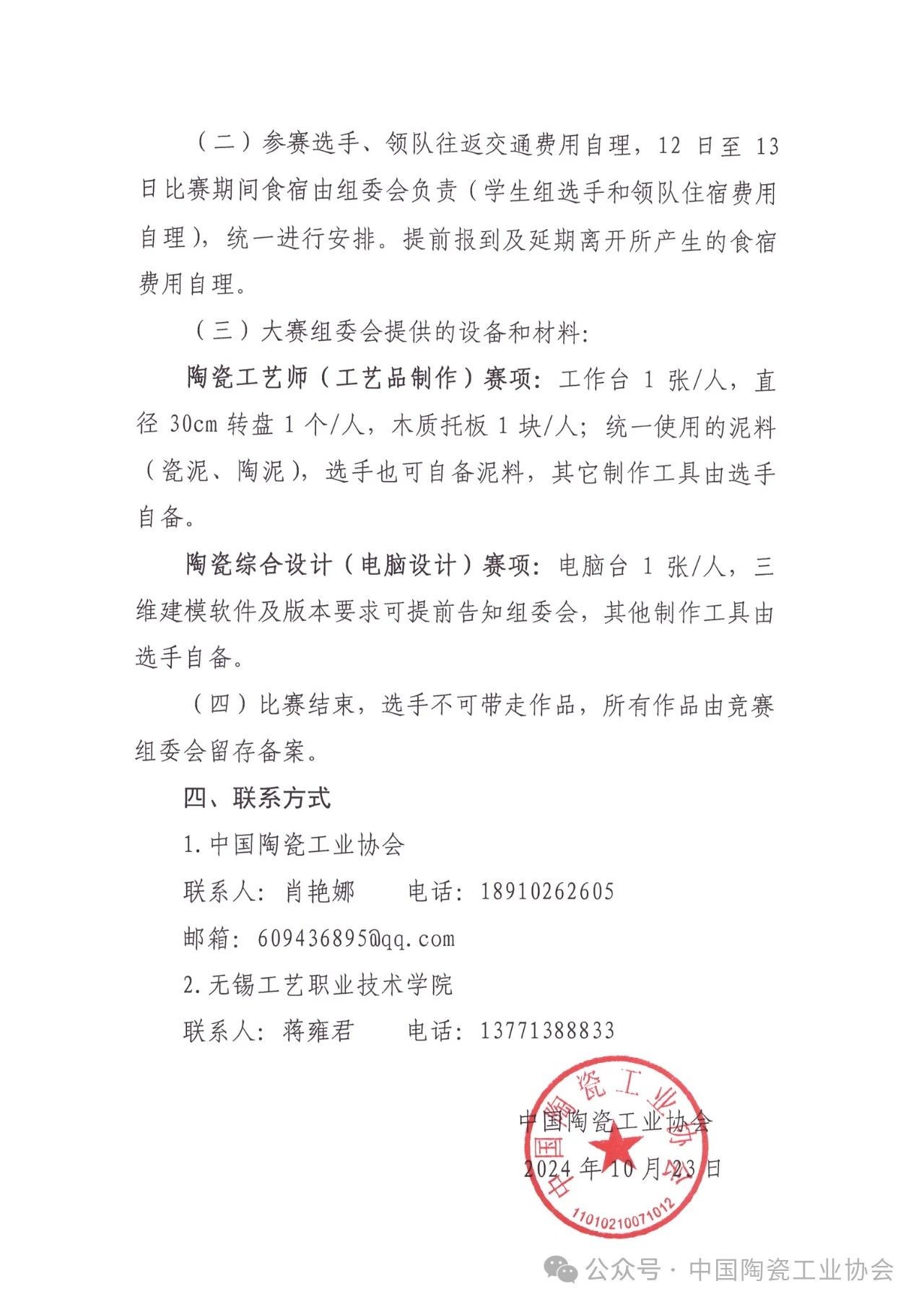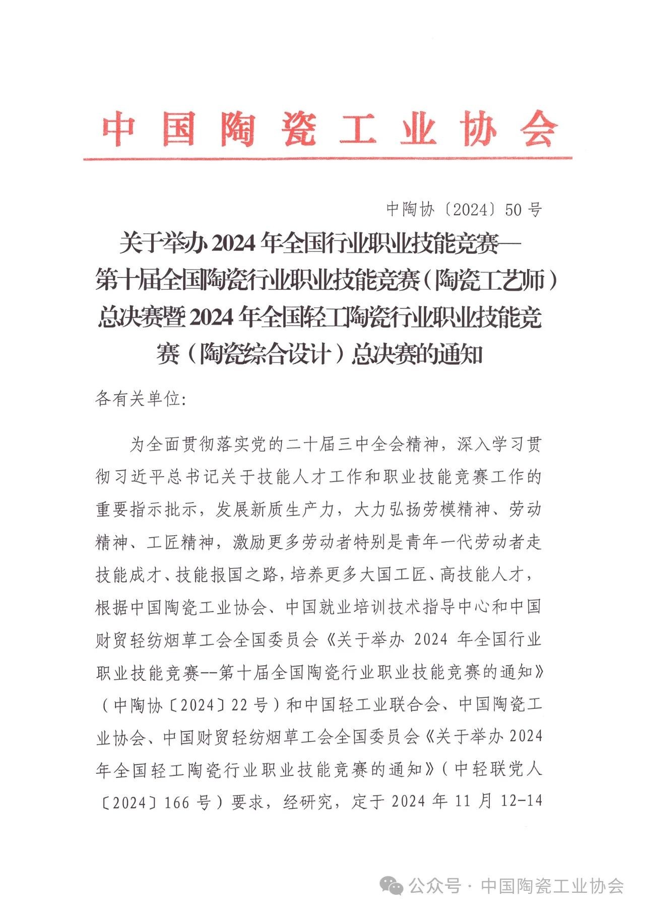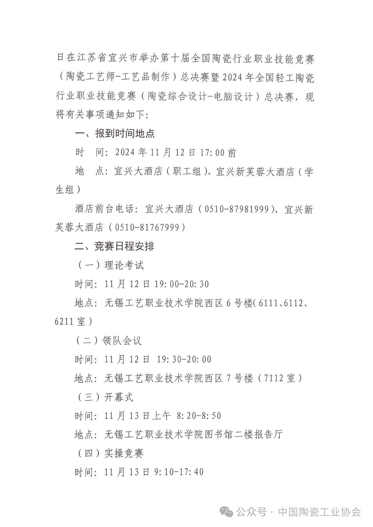 【通知】2024年第十届全国陶瓷行业职业技能竞赛(陶瓷工艺师)总决赛暨全国轻工陶瓷行业职业技能竞赛(陶瓷综合设计)总决赛的通知