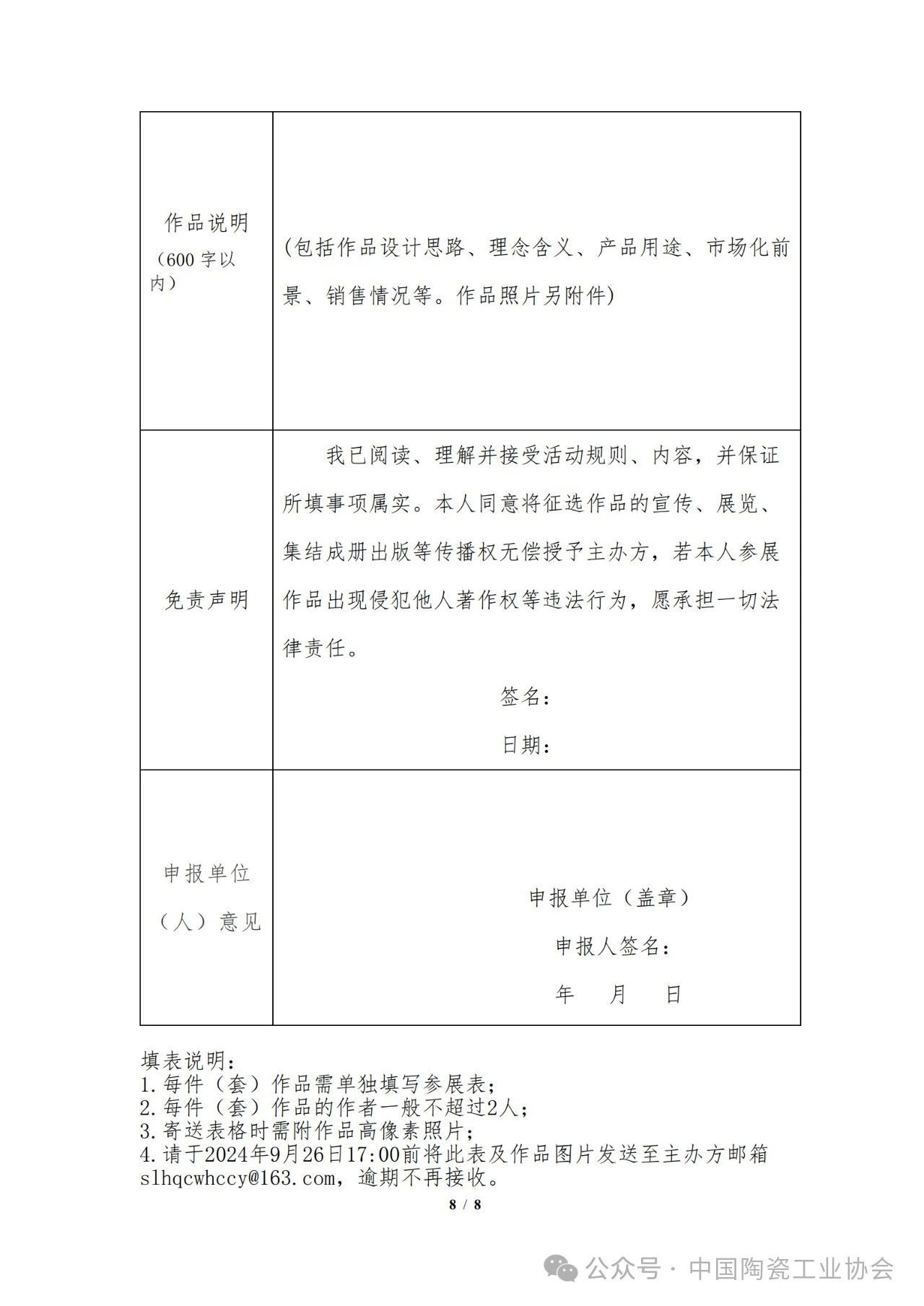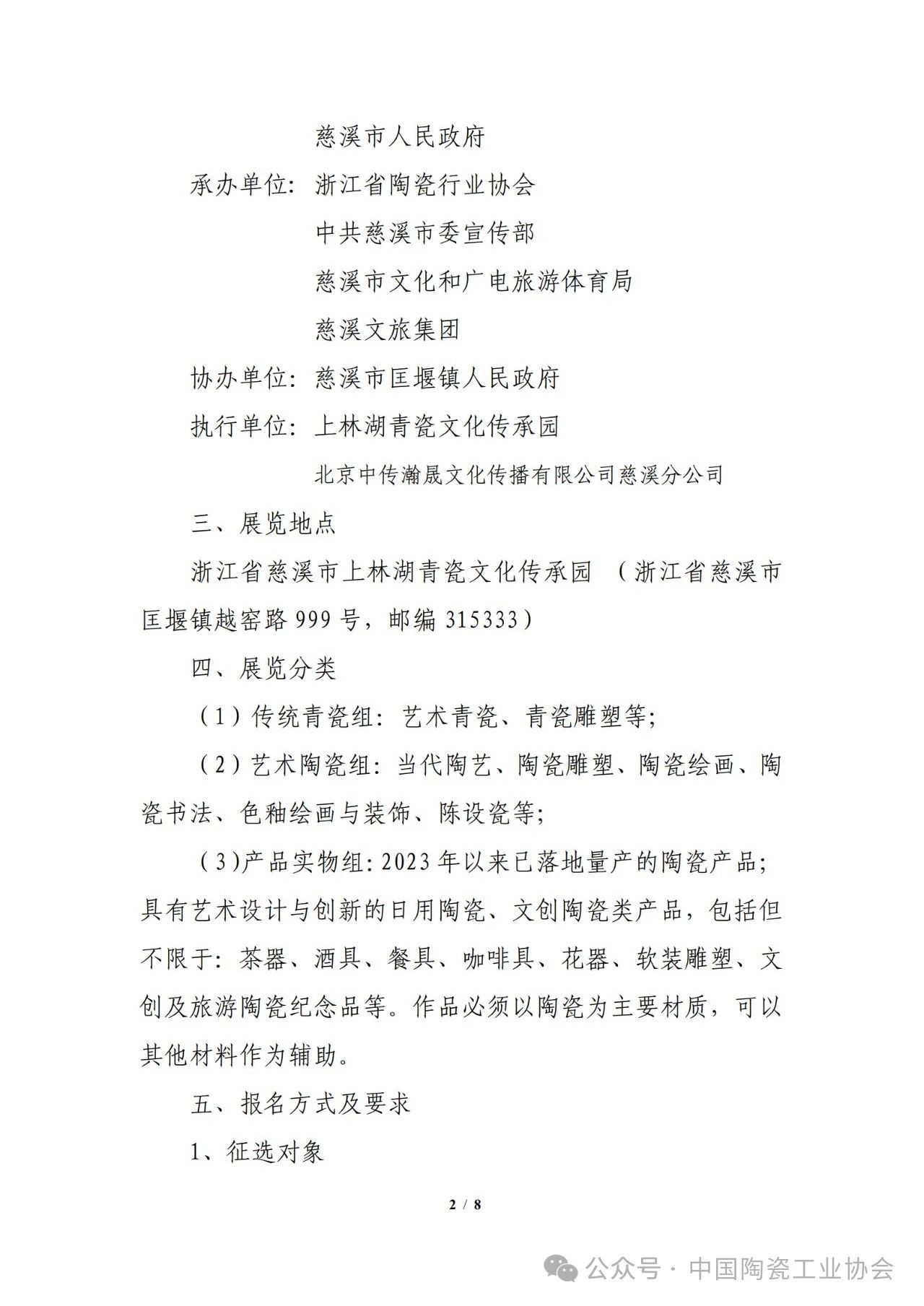 面向全球高校、陶瓷从业者、陶瓷艺术家、独立设计师、陶瓷企业、陶艺工作室等征集参展作品,以自愿申报为原则,采取企业、个人自行申报和推荐相结合的方式征选,无需报名费。