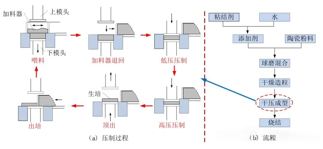 1)干压成型:该工艺主要通过把造粒后颗粒级配适合的粉末,倒入到金属模腔中,用压头对其施加压力,压头在模腔中进行移位,并将压力传递给模具中的粉体颗粒,使其被压实,最终形成具有一定形状和强度的陶瓷素坯产品。