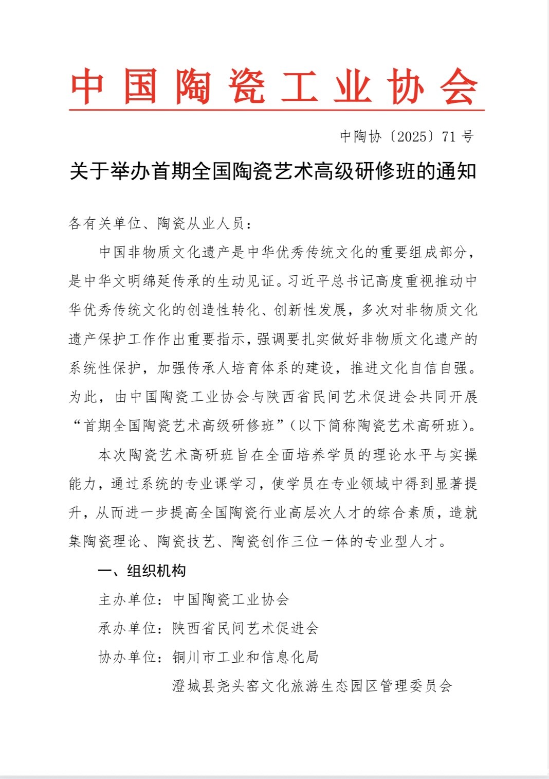 关于举办首期全国陶瓷艺术高级研修班的通知