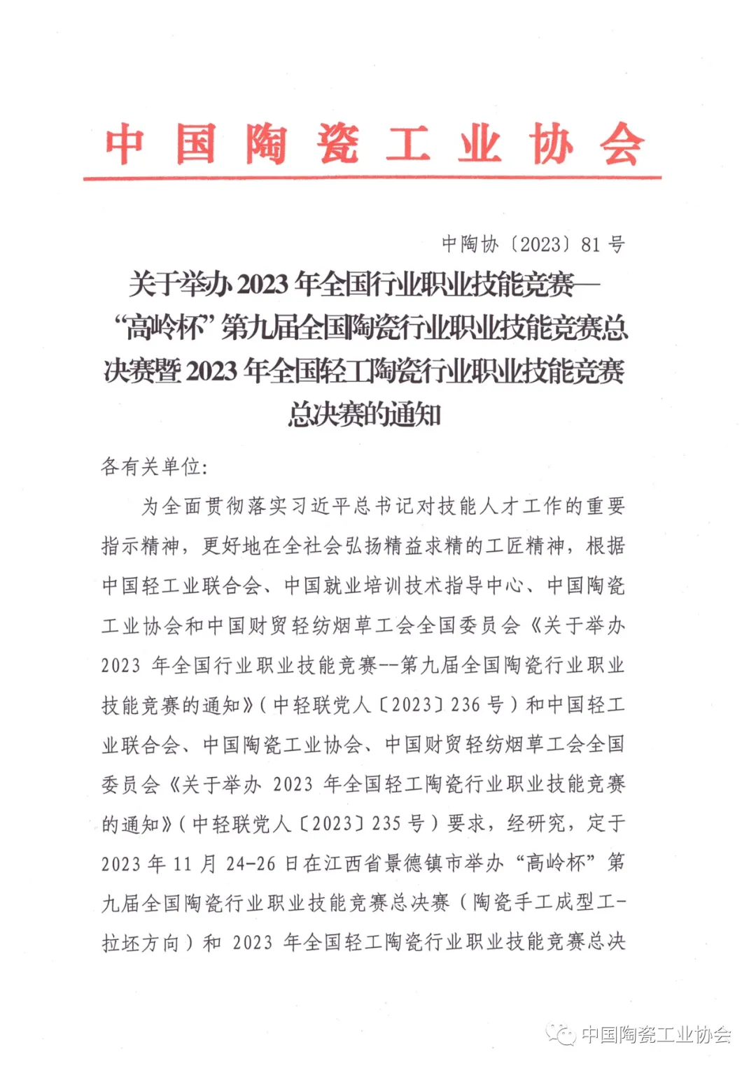关于举办2023年全国行业职业技能竞赛—“高岭杯”第九届全国陶瓷行业职业技能竞赛总决赛暨2023年全国轻工陶瓷行业职业技能竞赛总决赛的通知