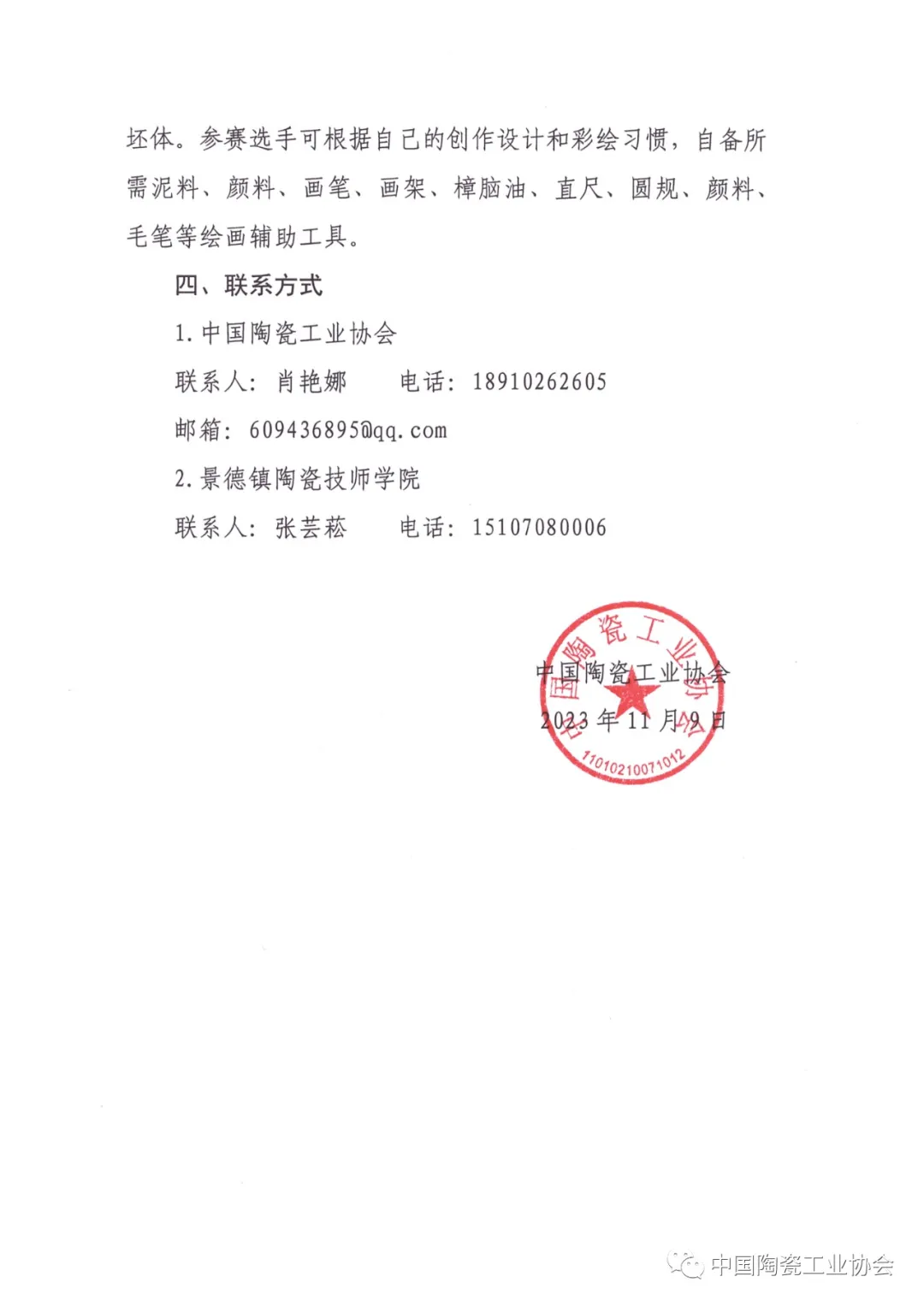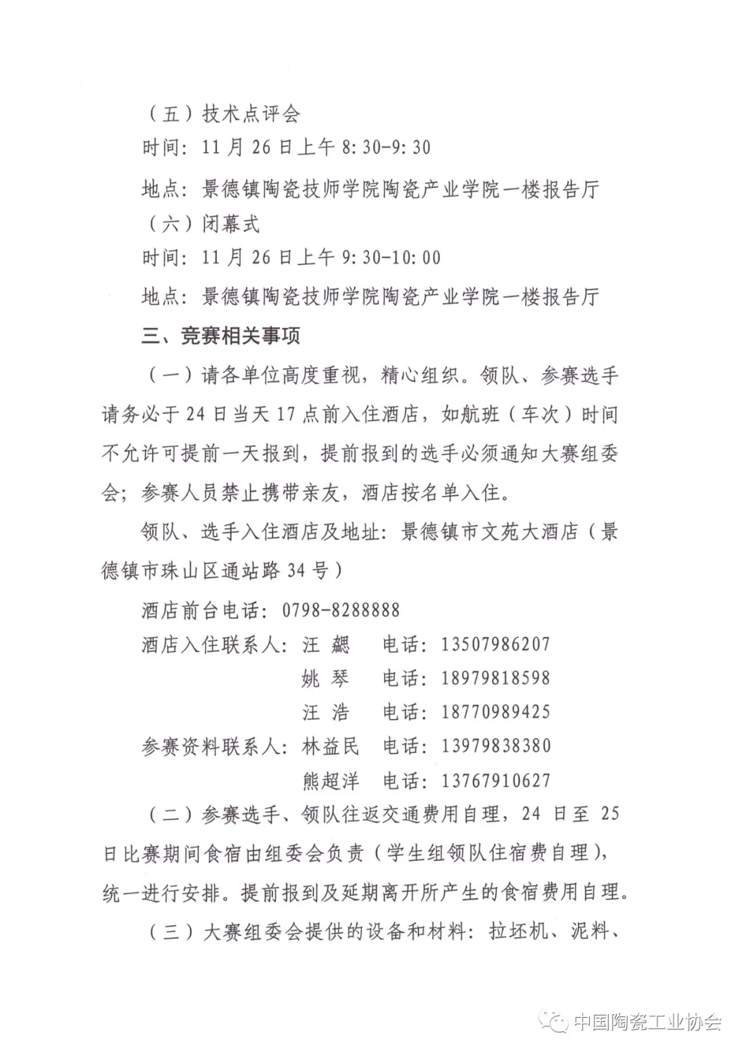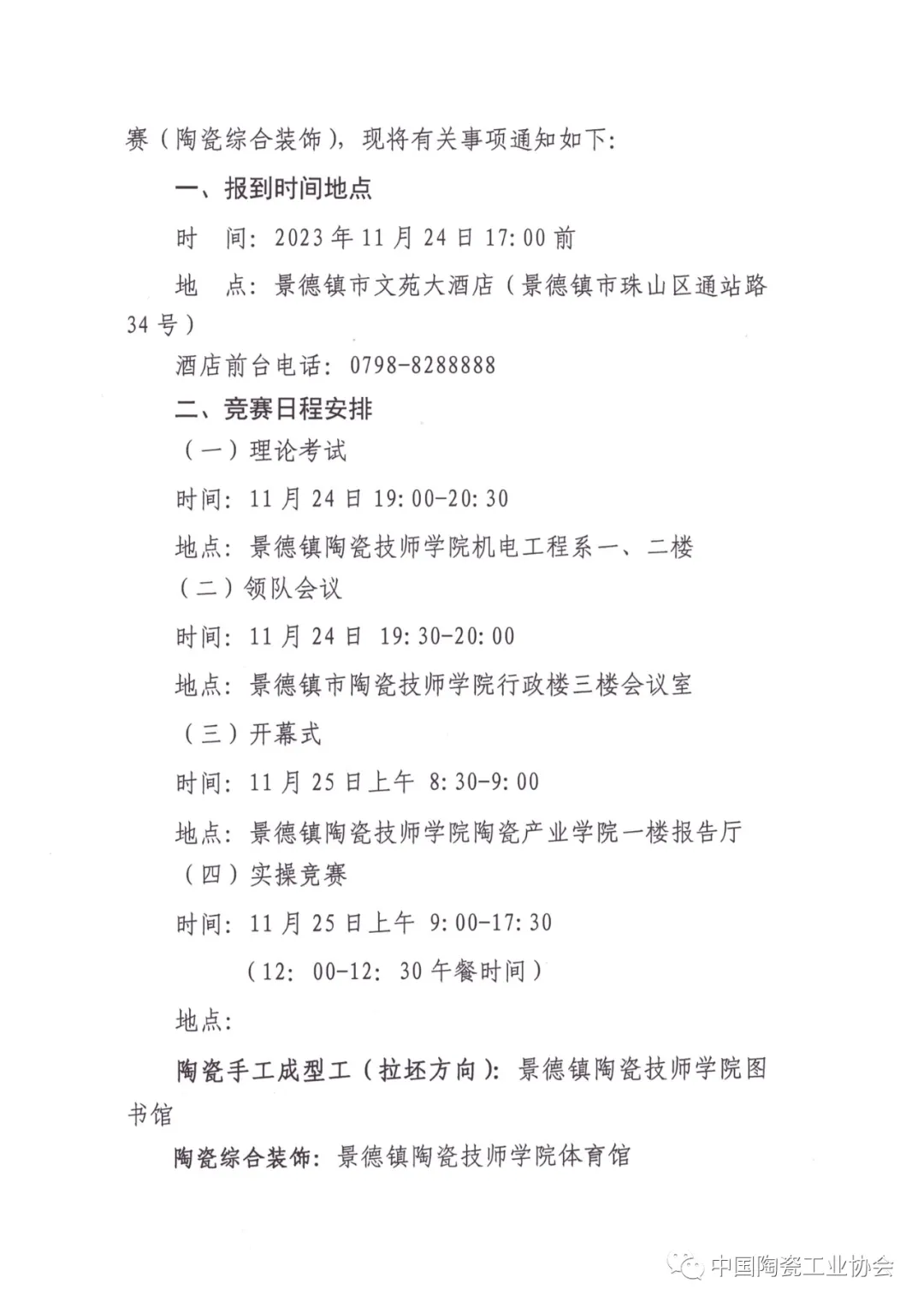 为全面贯彻落实习近平总书记对技能人才工作的重要指示精神,更好地在全社会弘扬精益求精的工匠精神,根据中国轻工业联合会、中国就业培训技术指导中心、电脑版taptap官方和中国财贸轻纺烟草工会全国委员会《关于举办2023年全国行业职业技能竞赛--第九届全国陶瓷行业职业技能竞赛的通知》(中轻联党人〔2023〕236号)和中国轻工业联合会、电脑版taptap官方、中国财贸轻纺烟草工会全国委员会《关于举办2023年全国轻工陶瓷行业职业技能竞赛的通知》(中轻联党人〔2023〕235号)要求,经研究,定于2023年11月24-26日在江西省景德镇市举办“高岭杯”第九届全国陶瓷行业职业技能竞赛总决赛(陶瓷手工成型工-拉坯方向)和2023年全国轻工陶瓷行业职业技能竞赛总决赛(陶瓷综合装饰),现将有关事项通知如下: