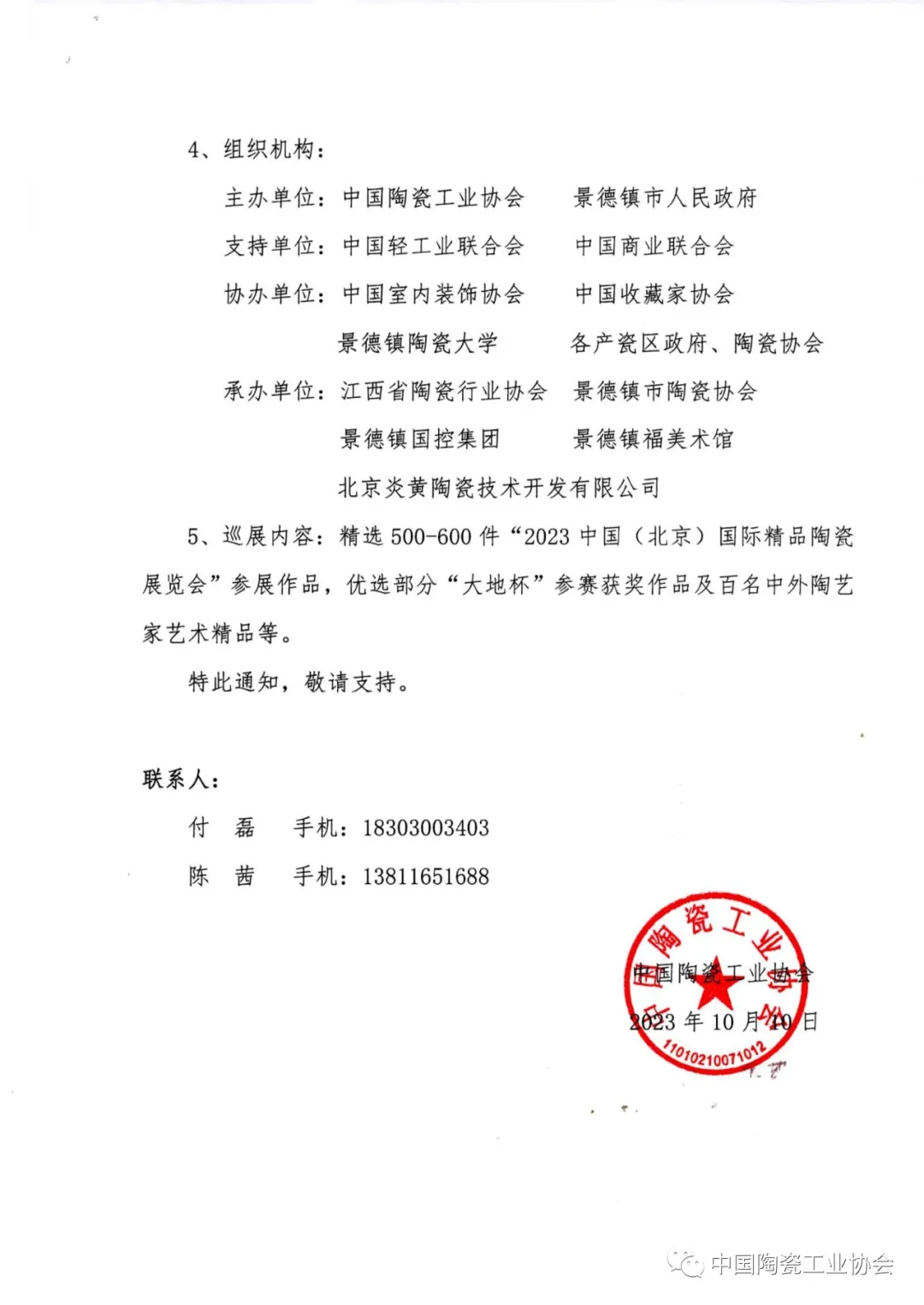 5、巡展内容:精选500-600件“2023中国(北京)国际精品陶瓷展览会”参展作品,优选部分“大地杯”参赛获奖作品及百名中外陶艺家艺术精品等。