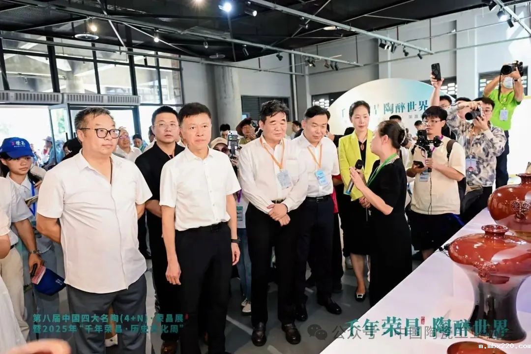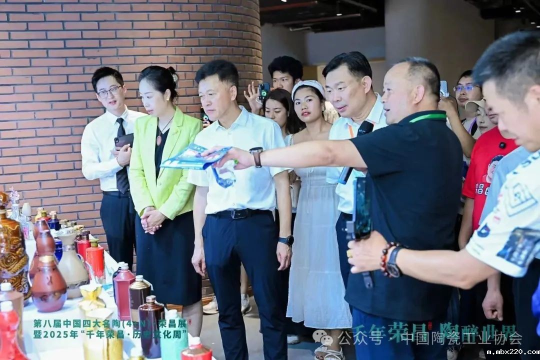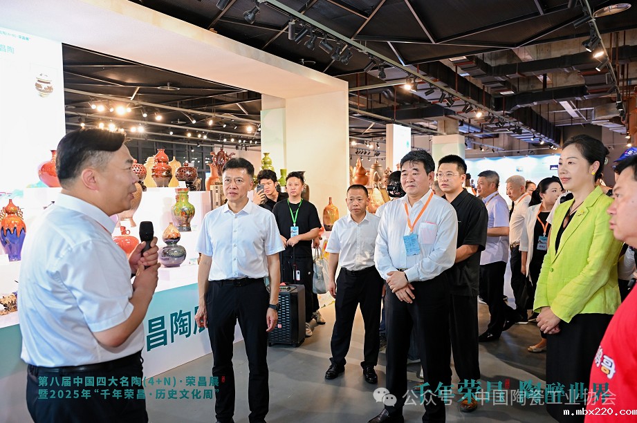 开幕式后,刘挺理事长在巡馆伊始着重介绍了四大名陶展的起源和发展历程。荣昌陶作为中国“四大名陶”之一,历经千年窑火淬炼,凝聚着巴渝文化的深厚底蕴和历代匠人的智慧。近年来,荣昌区委、区政府以高度的文化自觉和产业担当,立足时代潮头,创新实践路径,建成国家级示范性陶瓷文化创意产业园,推动传统陶器与现代制造深度融合,走出了一条“守正创新、跨界融合”的发展之路。今年,荣昌借网红城市热度强势破圈,卤鹅非遗通过网红达人矩阵火遍全网,千年陶文化与现代流量碰撞出别样火花。借网红流量走向全国,吸引海内外游客打卡千年陶坊,在古今交融中体现了这座网红之城的文化底蕴与产业活力。