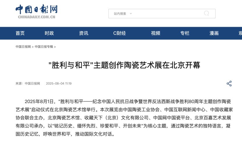 搜狐、网易、新浪、优酷、腾讯、爱奇艺等网络媒体:纷纷开辟专题页面,全方位呈现展览盛况。报道特别指出:“陶瓷艺术的脆弱与坚韧,恰如和平之珍贵与不易,每一件作品都在用独特的艺术语言诉说着那段可歌可泣的历史。