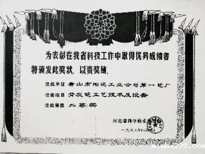 1982年9月,由一瓷厂和唐山陶研所组成的骨质瓷中试小组荣获轻工部科技成果(集体)三等奖。