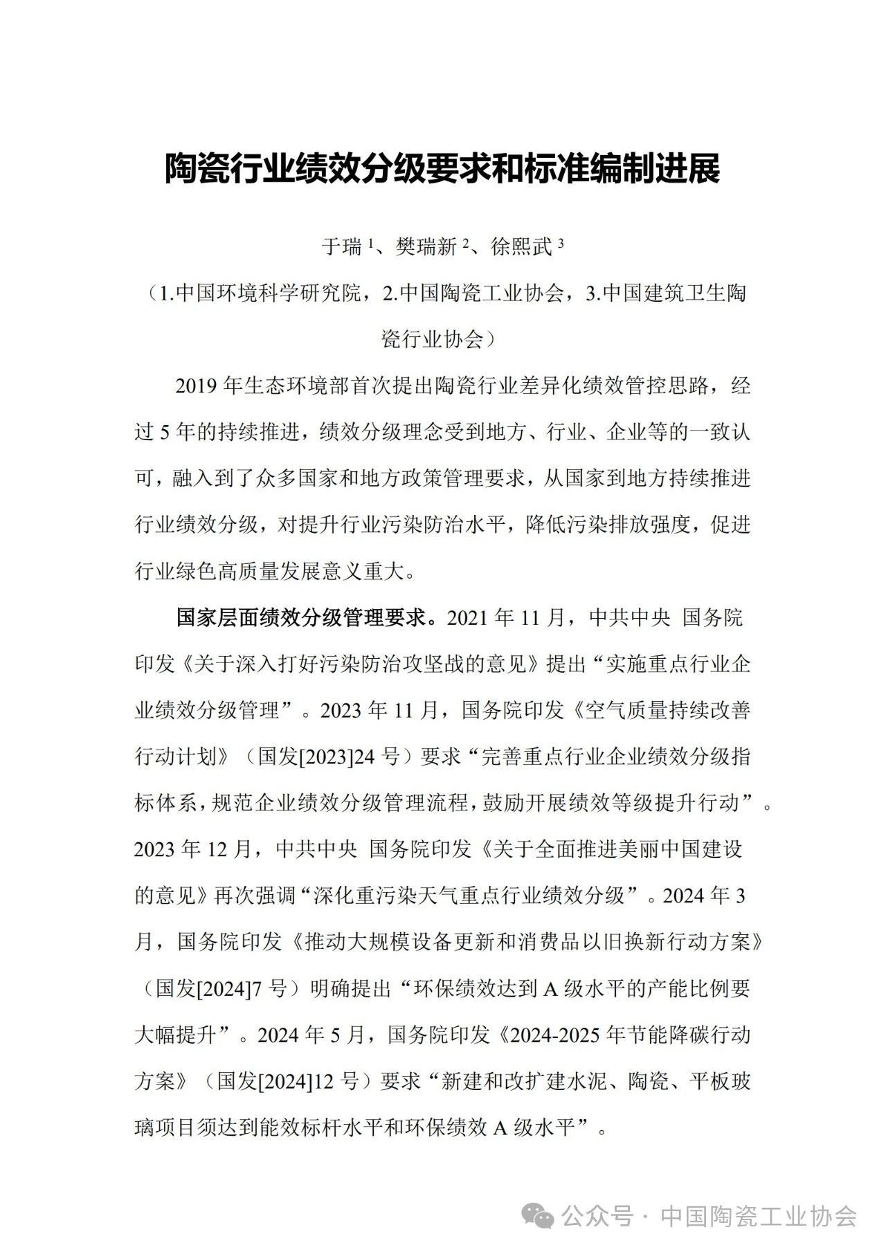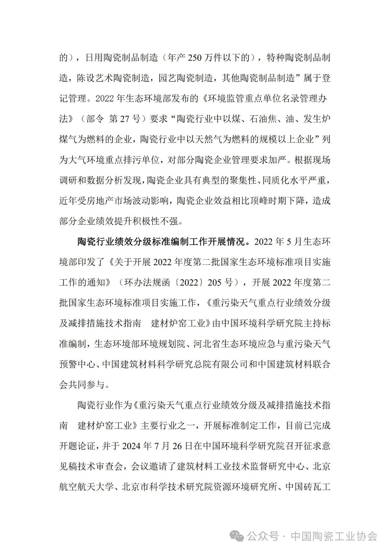 陶瓷行业绩效分级要求和标准编制进展